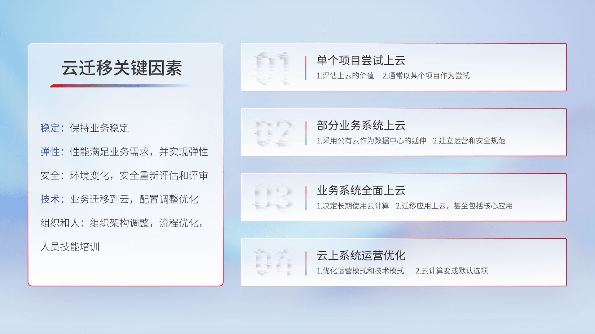 结合实际业务,,,从规划设计、、、云平台选型、、、、云原生改造、、数据迁移、、、、集成交付,,迁移全过程为客户识别最佳上云路径,,,做好风险识别管理,,设计网络架构、、身份权限、、安全审计合规、、、、操作审计、、日志审计、、、、监控告警策略、、多站点容灾设计等,,,,对云上基础设施进行整体规划,,,,提升IT治理水平,,,以满足弹性、、、高可用、、、、高性能的需求。。